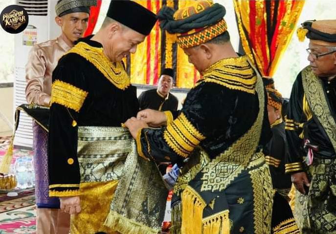 BANGKINANG – Pj Bupati Kampar, Hambali dinobatkan sebagai Datuk Rajo Limbago. Ia dinobatkan oleh ketua Lembaga Adat Kampar (LAK), Yusri. Propesi penobatan dilangsungkan pada momen dalam rangkaian peringatan Hari Jadi Kabupaten Kampar ke-74 tahun di Balai Adat Kampar, Bangkinang Kota, (6/2/2024).