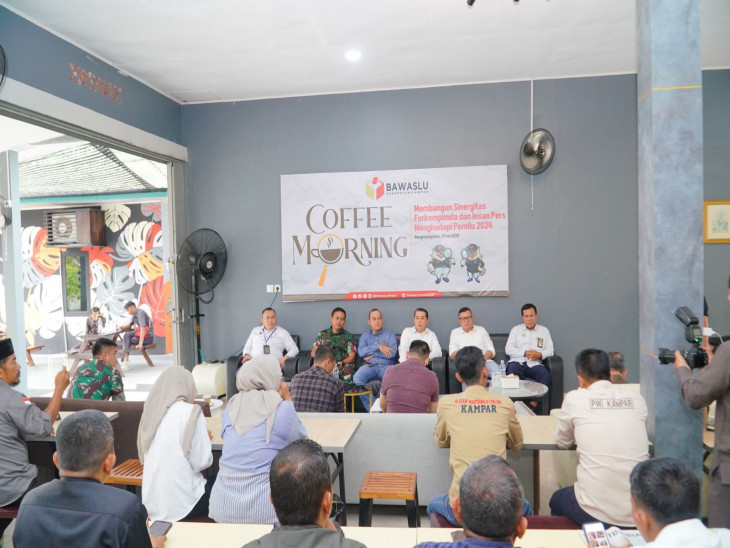 Bangkinang Kota- Badan Pengawas Pemilu (Bawaslu) Kabupaten Kampar bersama dengan Forum Koordinasi Pimpinan Daerah (Forkopimda) Kabupaten Kampar menggelar Coffe Morning bersama insan pers di Kabupaten Kampar di Kedai Kopi Tiga Pilar di Komplek Markas Kodim 0313 /KPR di Bangkinang Kota, Senin (12/02/24).
