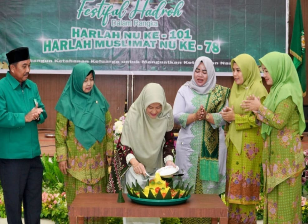 Bangkinang Kota, Pj. Ketua TP PKK Kabupaten Kampar Ricama Djayanti Hambali membuka secara Resmi Festival Hadroh se Provinsi Riau dalam rangka Hari Lahir (Harlah) Muslimad NU ke-78 dan NU ke -101 Tahun 2024 ditandai dengan pemotongan tumpeng di Aula Kantor Bupati Kampar pada Minggu (25/2).