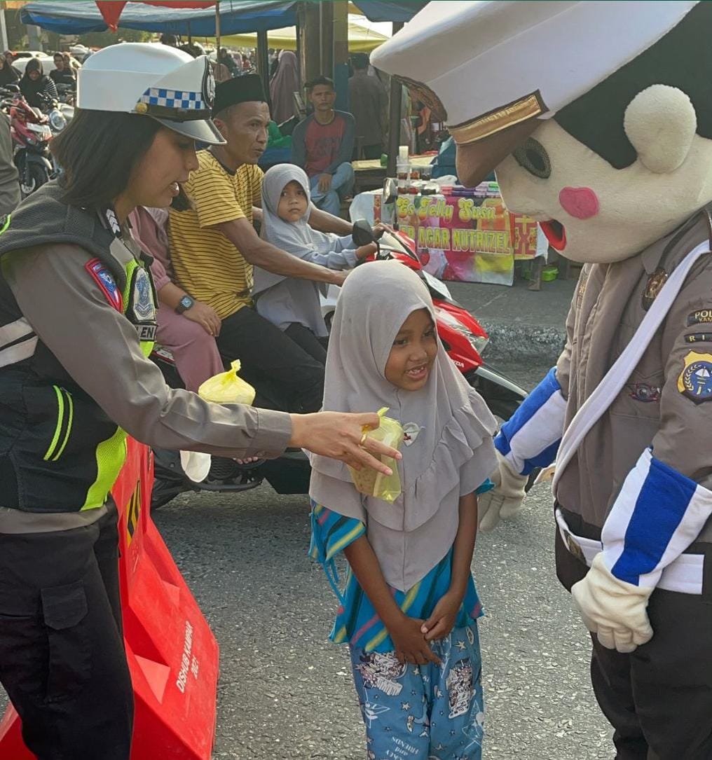 Kasat Lantas, AKP Viola Dwi Anggreni bersama personil Sat Lantas Polres Kampar di depan Ramayana Bangkinang sasaran pembagian takjil ini.