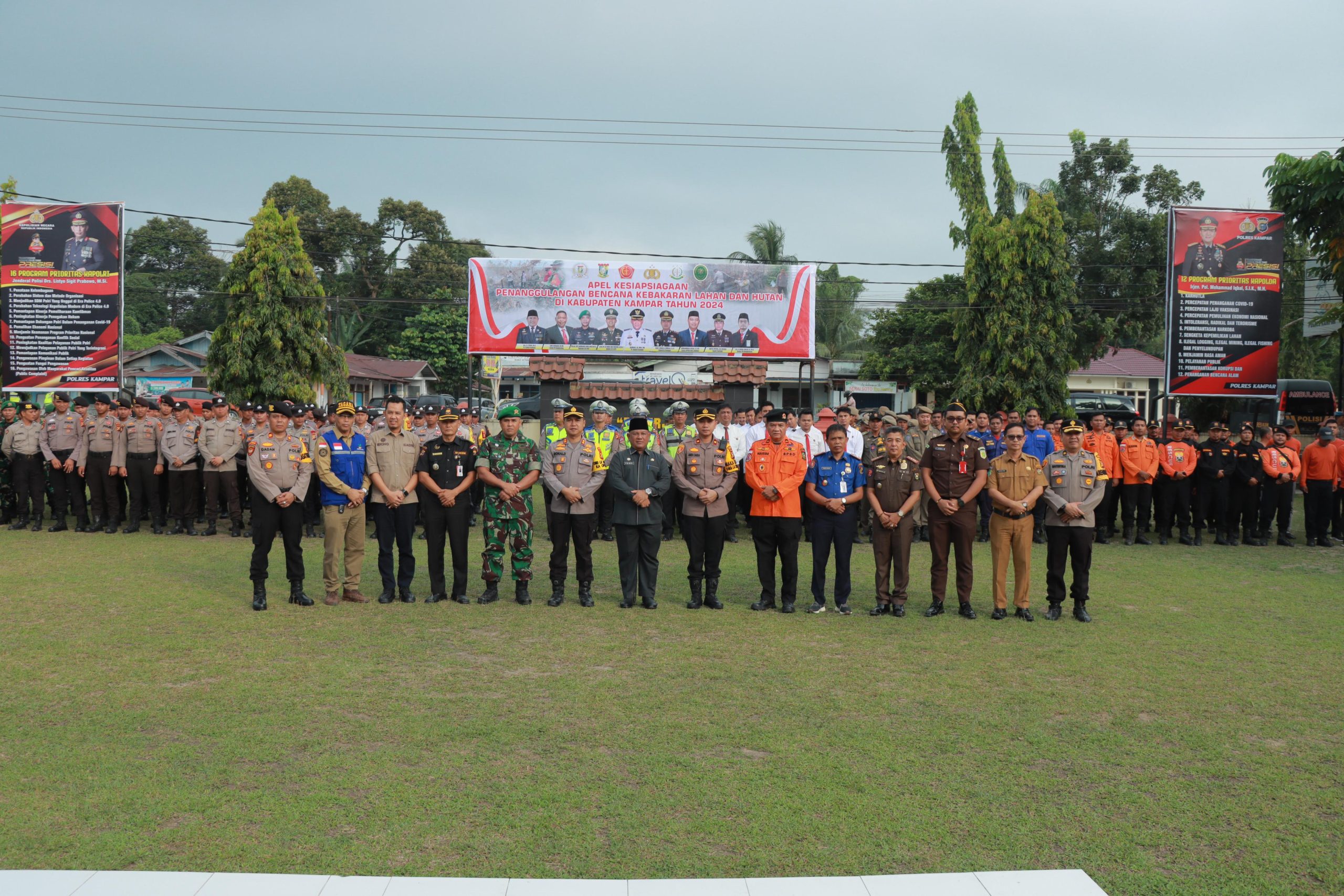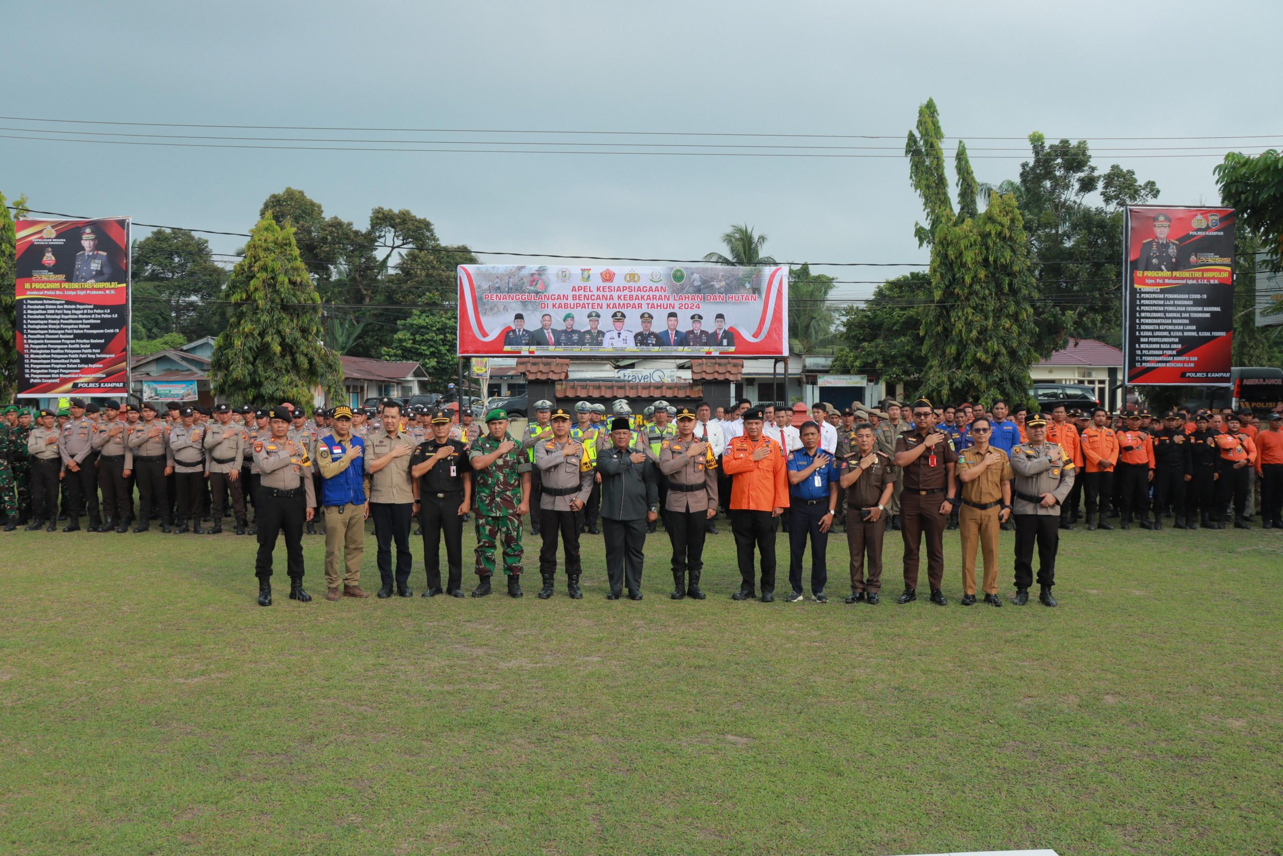 Apel Kesiapsiagaan penanggulangan Karhutla tahun 2024 di Kabupaten Kampar ini dipimpin langsung oleh Kapolres Kampar AKBP Ronald Sumaja dan dihadiri Pj Bupati Kampar yang wakili Oleh Drs.Yusri , Dandim 0313/ KPR Letkol Inf. Setiawan Hadi Nugroho S.H. M.I.P Danyon 132/BS diwakili oleh Komandan Kompi Bantuan Lettu Inf Sumarlin, Kepala Kejaksaan Negeri Kampar yang diwakili Dikri, Kalaksa BPBD Kampar Drs. Agustar, Kadis Damkar Hendri Dunan serta Perwakilan Forkopimda lainnya.