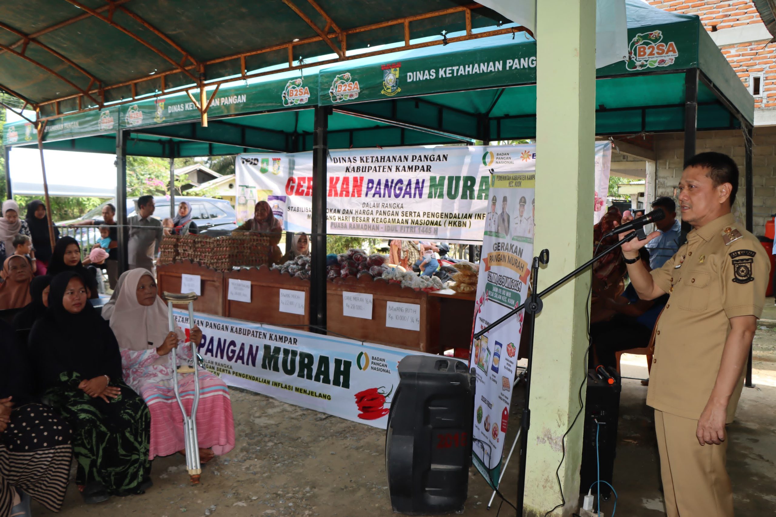 Silam, Kuok. Pemerintah Kabupaten Kampar melalui Dinas Ketahanan Pangan Kabupaten Kampar dan Bulog Kabupaten Kampar menggelar Pasar Murah dengan taja Gerakan Pangan Murah dalam rangka stabilisasi Pasokan dan Harga Pangan serta pengendalian Inflasi menjelang Hari Besar Keagamaan Nasional (HKBN) di Desa Silam Kecamatan Kuok, Senin (3/6).