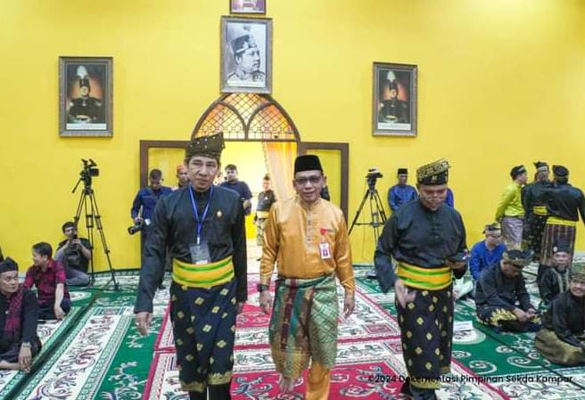 SIAK – Pj Bupati Kampar diwakili Asisten III Setda Kampar, Azwan menghadiri acara penobatan gelar baru kepada Tuan Bupati Siak Drs. H. Alfedri, M.Si., dan Tuan Wakil Bupati Siak H. Husni Merza, BBA, MM, Ahad (9/6/2024).