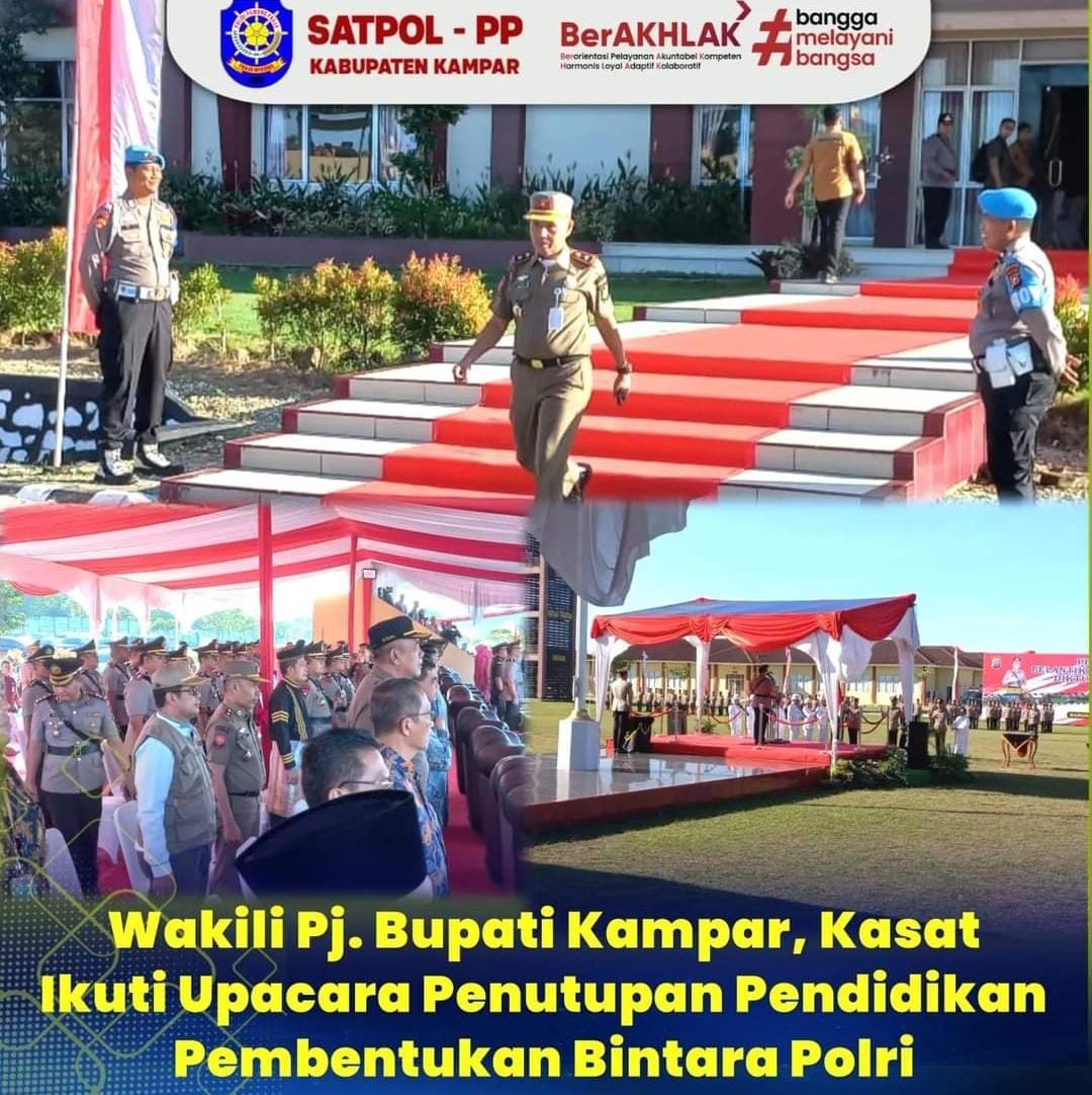 Beritatuan.com, Kampar — Pj.Bupati Kampar yang di wakili Kasat Pol PP hadiri upacara penutupan Pendidikan Pembentukan Bintara (Diktukba) Polri Sekolah Polisi Negara (SPN) Polda Riau Tahun Ajaran (TA) 2023 – 2024 di Lapangan Utama SPN Polda Riau, Kecamatan Tambang, pada Kamis, (11/07/2024).