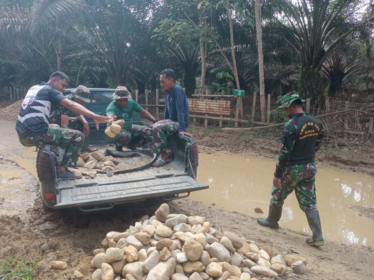 Dengan dibantu menggunakan alat berat dari Dinas Pekerjaan Umum Kabupaten Kampar, personil satgas TMMD pada sasaran 1 dikakukan penanaman 60 batang kayu cerocok agar Box Culvert.