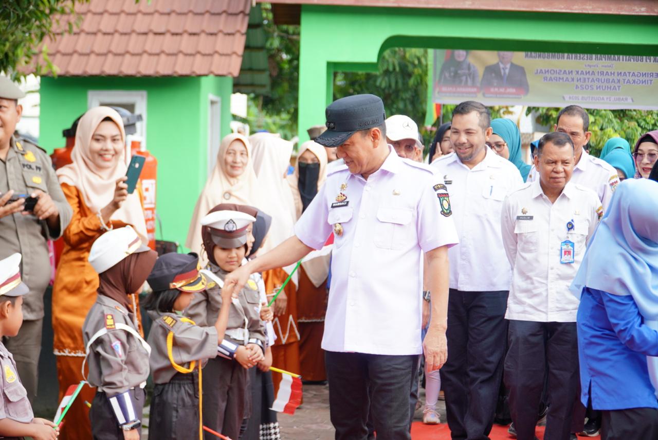 Pj. Bupati Kampar Hambali, SE, MH yang didampingi langsung oleh Pj Ketua TP PKK yang juga sebagai Bunda PAUD Kabupaten Kampar Ricana Djayanti Hambali memimpin apel peringatan Hari Anak Nasional ke-40 untuk tingkat Kabupaten Kampar tahun 2024 yang bertemakan ‘Anak Terlindungi Indonesia Maju’ yang bertempat di Lapangan Upacara SDN 001 Salo Kabupaten Kampar, pada Rabu (21/08/2024).