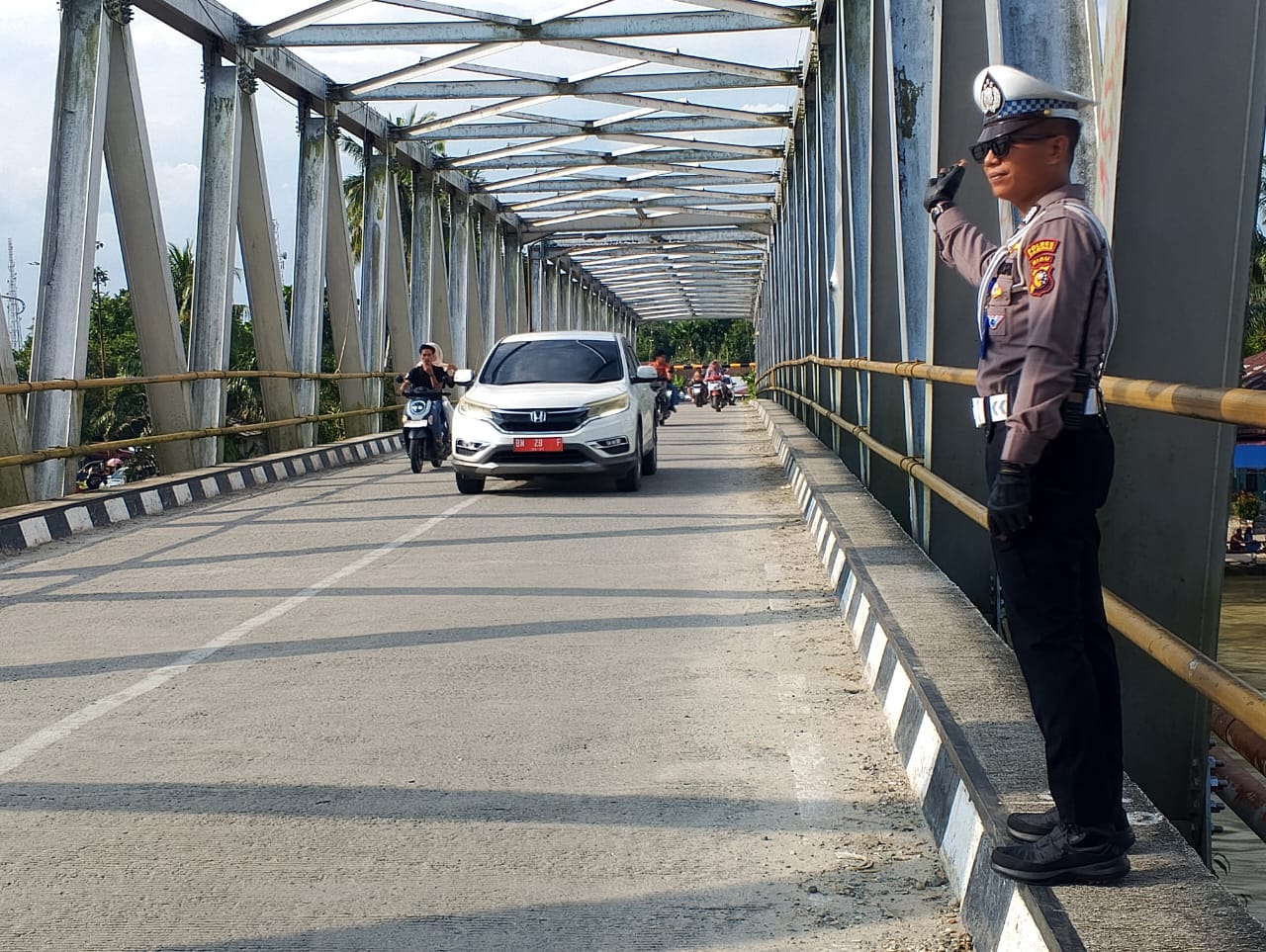 Dari arah jembatan Water Front City (WFC) Bangkinang, Kelurahan Bangkinang, Kecamatan Bangkinang Kota dan begitu juga dari arah jembatan Bangkinang, Desa Pulau Lawas, Kecamatan Bangkinang tampak beberapa personil Polres Kampar yang berpakaian resmi siaga dan standby mengatur arus lalu lintas.