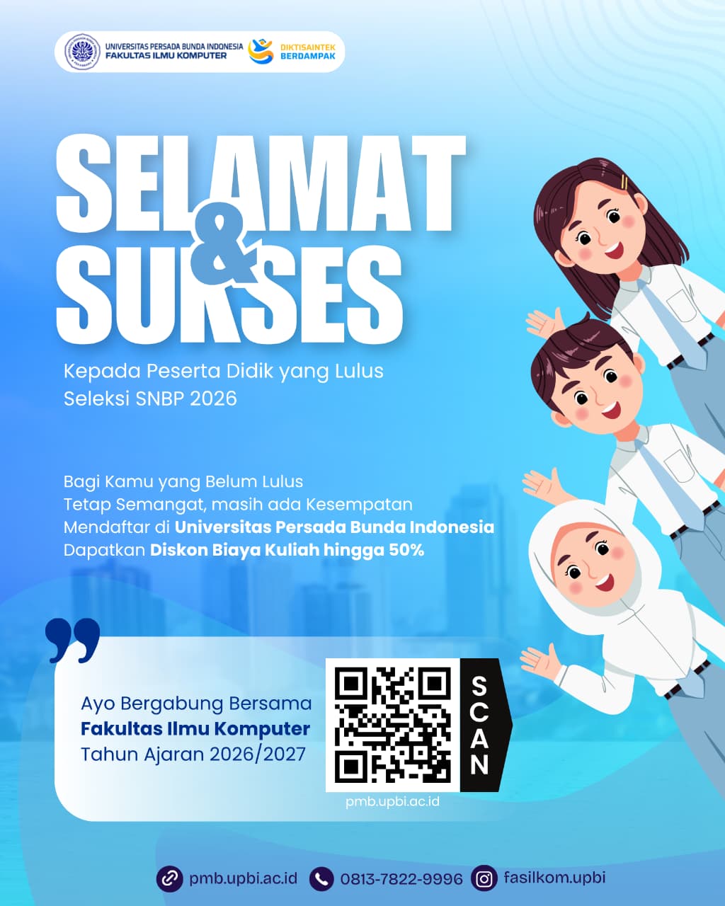Sebagai bentuk dukungan terhadap generasi muda, Fakultas Ilmu Komputer Universitas Persada Bunda Indonesia membuka kesempatan bagi calon mahasiswa baru untuk bergabung pada tahun ajaran 2026/2027. Tidak hanya itu, tersedia juga diskon biaya kuliah hingga 50% sebagai bentuk komitmen dalam mendukung akses pendidikan yang lebih luas.